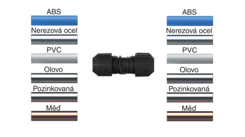 Spojky umožňují spojení PVC, mědi, oceli, nerezu i plastových trubek.